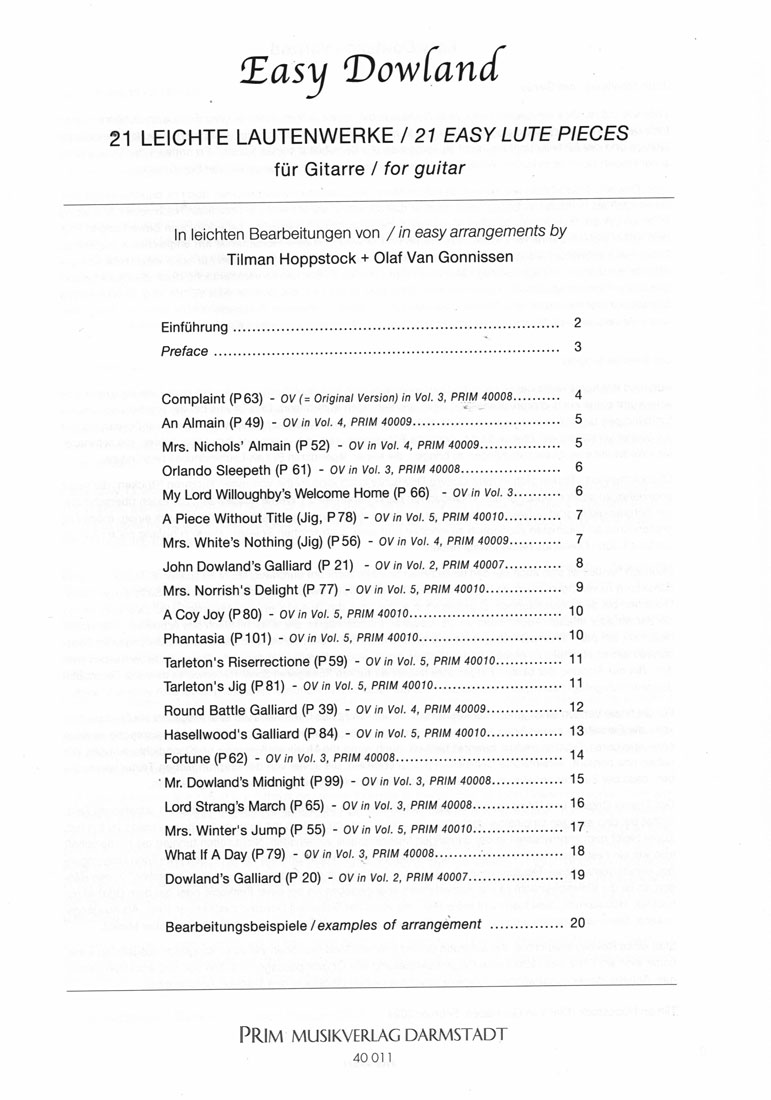Im Gesamtwerk Dowlands finden sich auch eine Reihe von meist kürzeren Stücken, die recht angenehm zu spielen sind. Für den vorliegenden Band haben Olaf Van Gonnissen und Tilman Hoppstock 21 Werke ausgewählt, die einen überschaubaren Schwierigkeitsgrad aufweisen. Um eine Sammlung zu veröffentlichen, die den Titel “Easy Dowland” zu Recht trägt, haben die beiden Herausgeber zudem alle Stücke sehr behutsam nachbearbeitet und soweit erleichtert, dass sie ohne Qualitätsverlust spürbar bequemer auf der Gitarre auszuführen sind. Mit Vorwort in dt. und engl. und Fingersätzen der Bearbeiter.